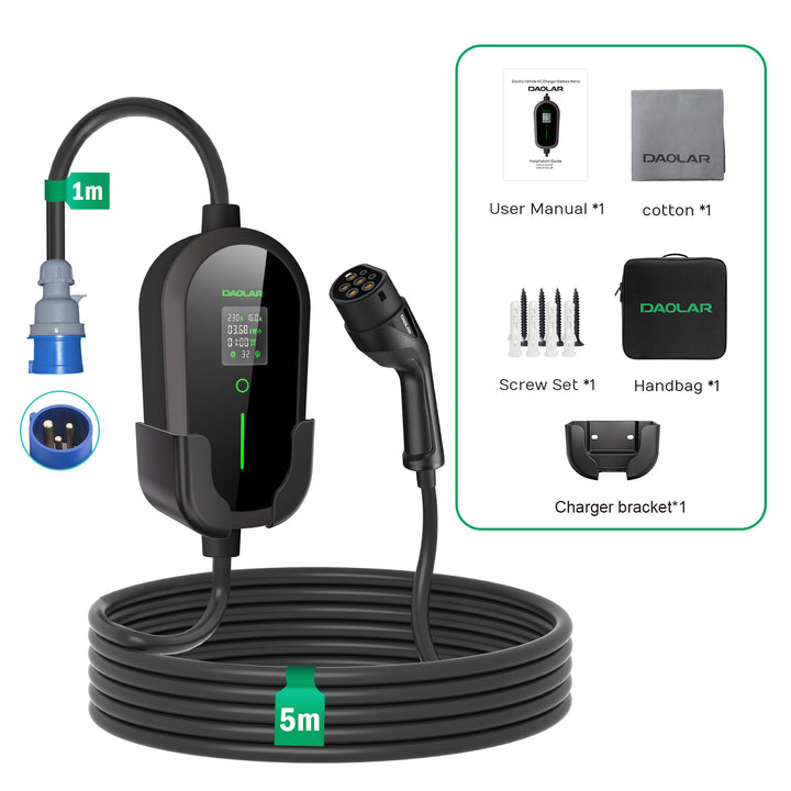 Daolar laddningskabel typ 2 CEE-kontakt 7,4 kW [1-fas | 5 m | 6-32 A] med justerbar laddningseffekt, EV-laddare och mobil laddningsstation/väggbox för ID.3, ID.4, ID.5, Model Y/3, e-up, e-tron, Zoe