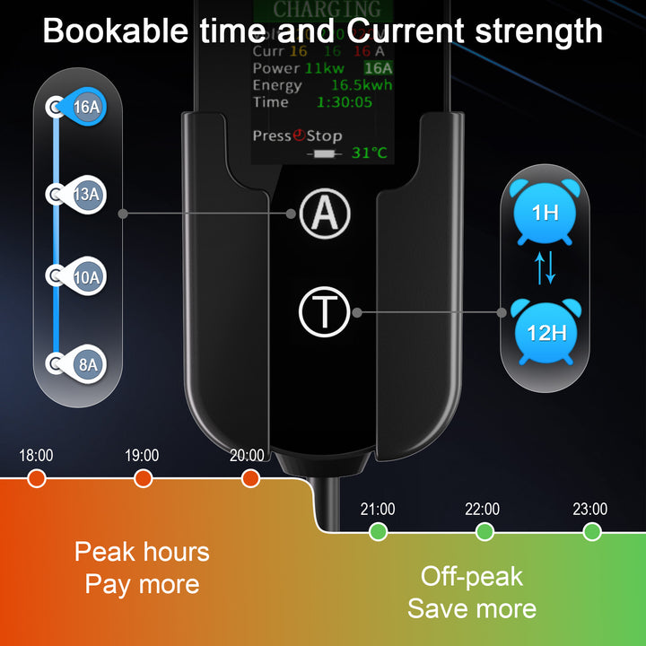 - ⏱ Tidsbokningsavgift (1-12 timmar): Ställ in din laddare att starta vid en specifik tidpunkt och dra nytta av elpriser utanför högbelastning för maximal besparing.