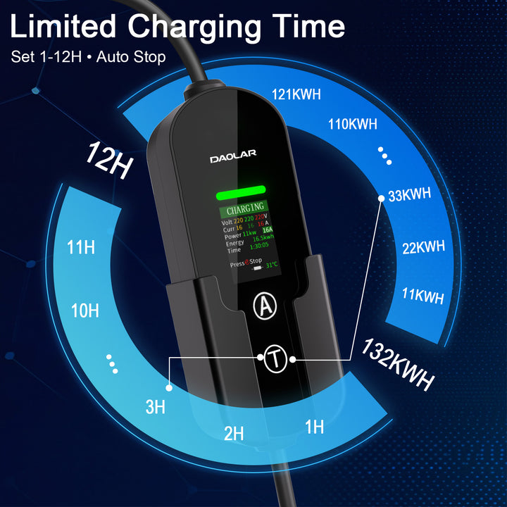 Många elbilsägare föredrar att ladda sitt fordon till omkring 80 % för att hjälpa förläng batteriets livslängd och bevara dess hälsaMed YUQ1 får du kontroll! Enkelt begränsa laddning genom att ställa in en varaktighet (1–12 timmar). Till exempel ger en 2-timmars laddning cirka 22 kWh effekt. Perfekt för att undvika överladdning och utnyttja elpriser under lågtrafik.